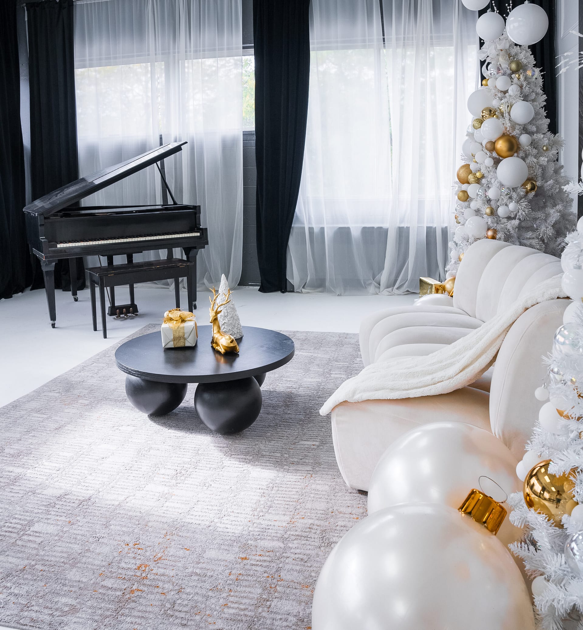 A chic, modern studio featuring a plush baby grand piano, oversized marble fireplace, and tasteful décor. Perfect for high-end products that require an air of sophistication and luxury.