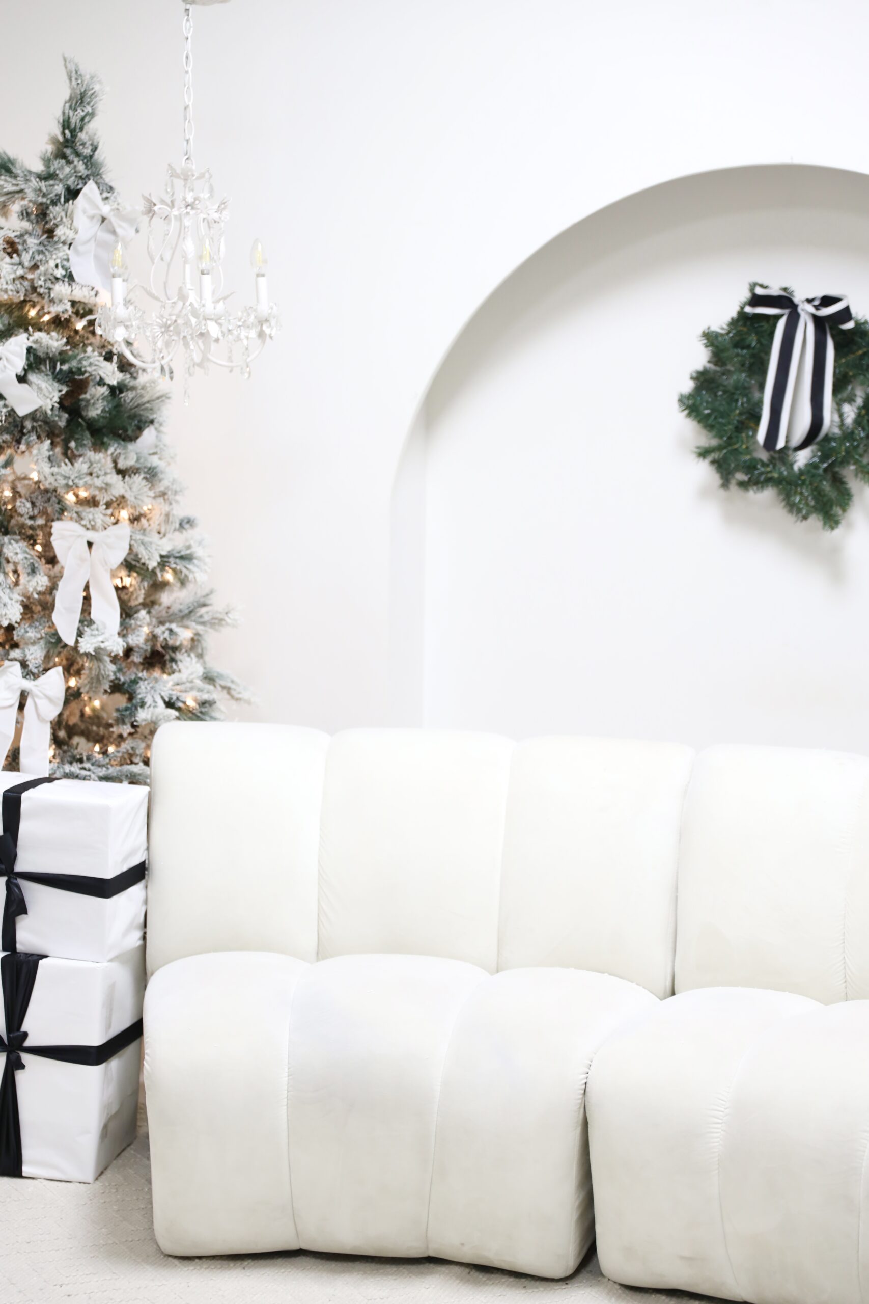 Minimalist yet luxurious, the space glows with delicate textures, pearly accents, and a hint of sparkle, creating the perfect backdrop for timeless holiday portraits and editorial-style moments.