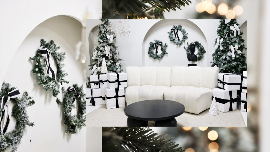 Experience the serene magic of The Saloon’s Holiday Setup, where modern refinement meets festive charm.